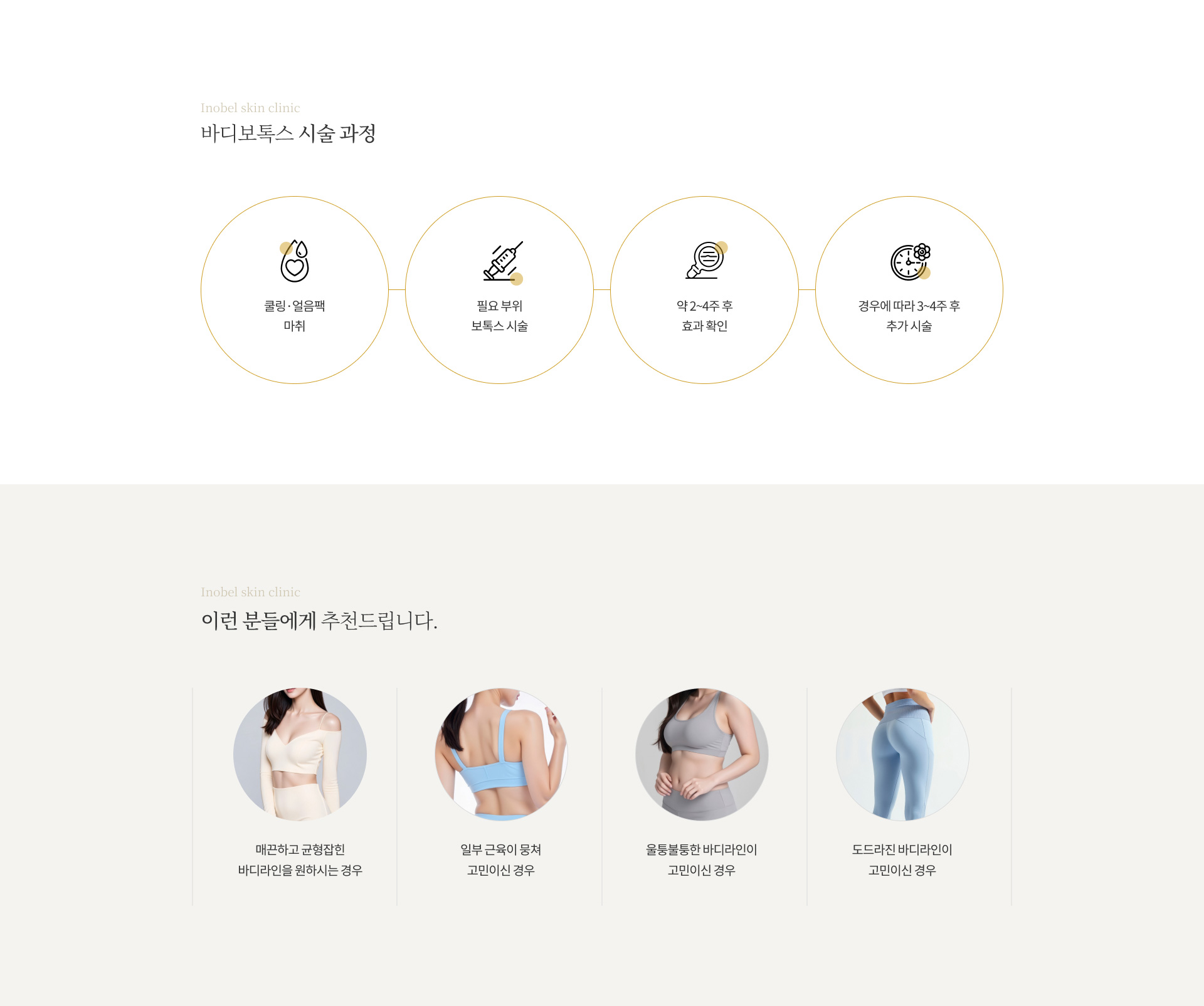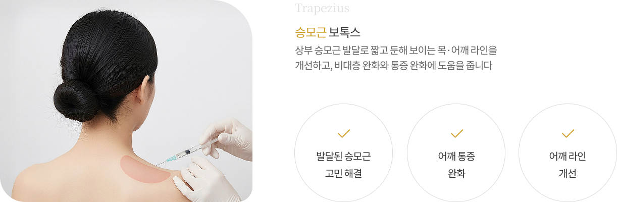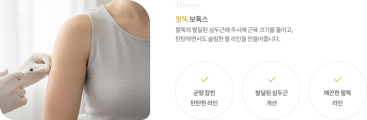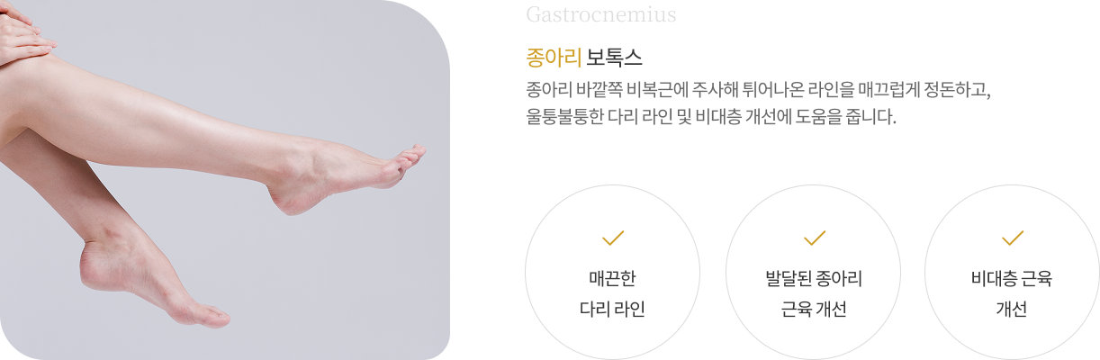 바디보톡스는 근육의 과도한 긴장을 완화하고 매끄러운 바디라인으로 개선해드리는 시술입니다. 대표적으로 종아리, 승모근, 팔뚝, 허벅지에 시술이 이루어지며 비대칭 개선, 통증 완화 등 기능적인 목적도 함께 가지고 있습니다.